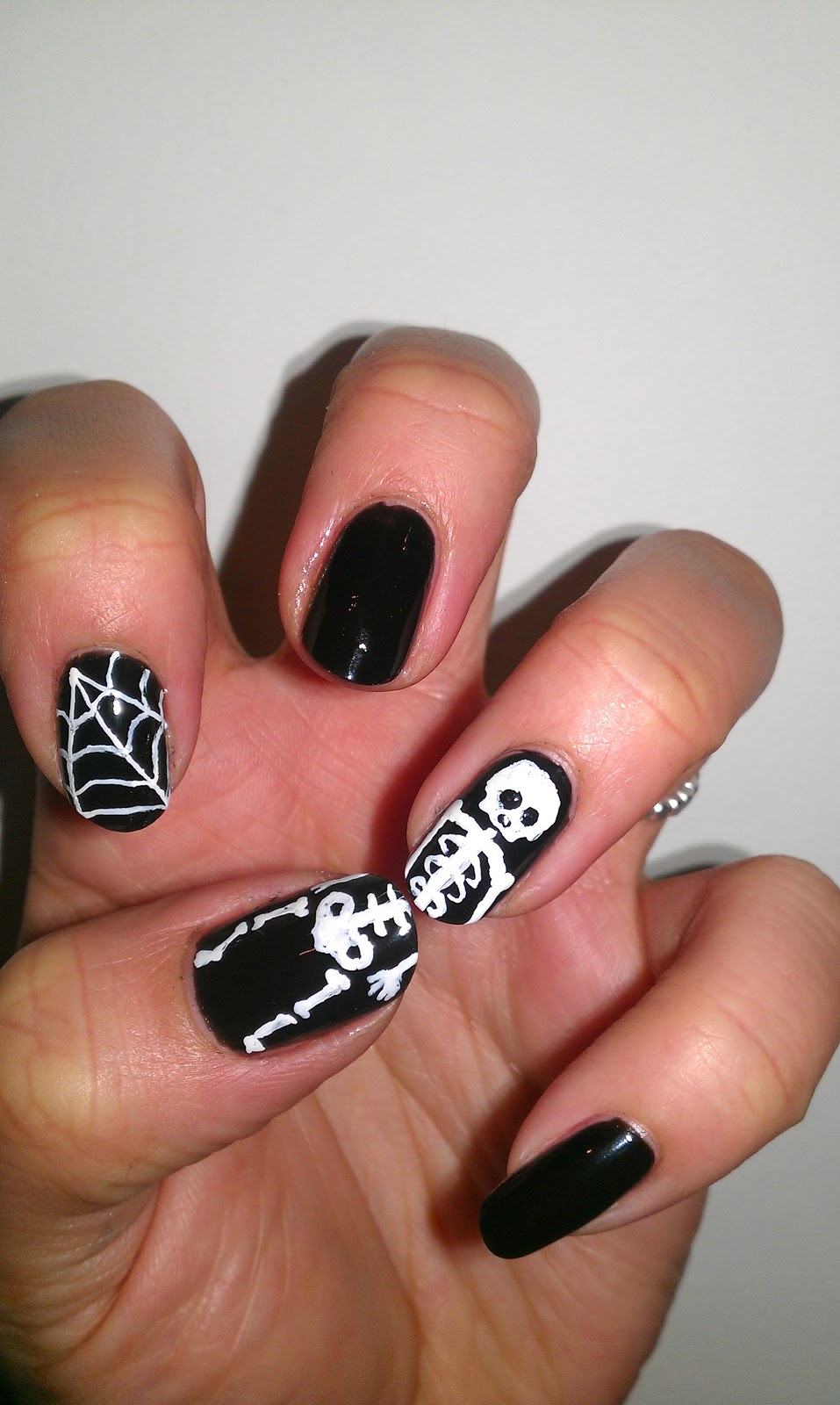 For my Halloween nails I decided on black (of course!) with three accent nails - one cobweb, and a two nail skeleton.